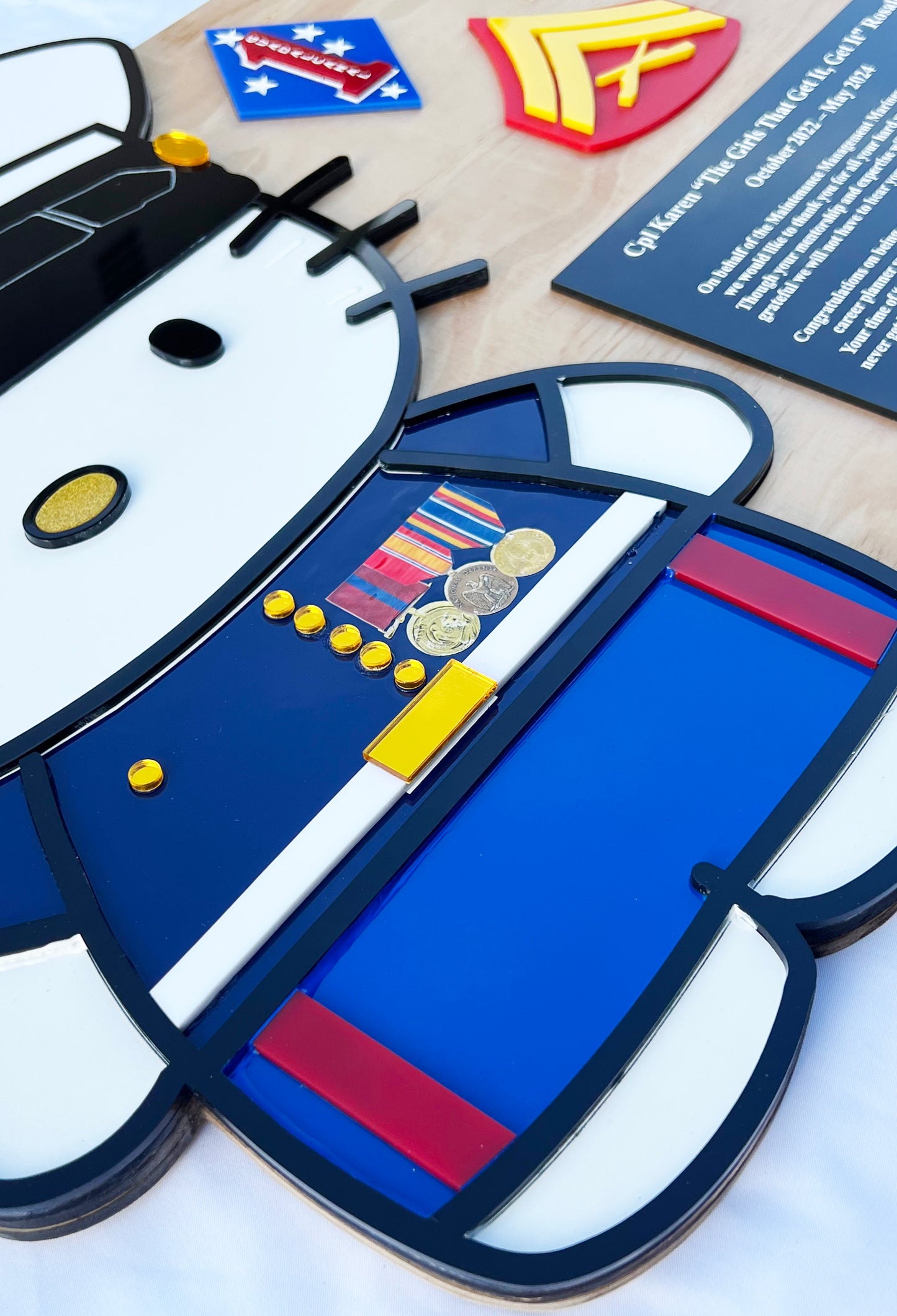 * Each military plaque that I make is CUSTOM and no two plaques are the same since I use mixed media for each plaque (i.e. wood, acrylic, paint, fabric, leather, etc.)