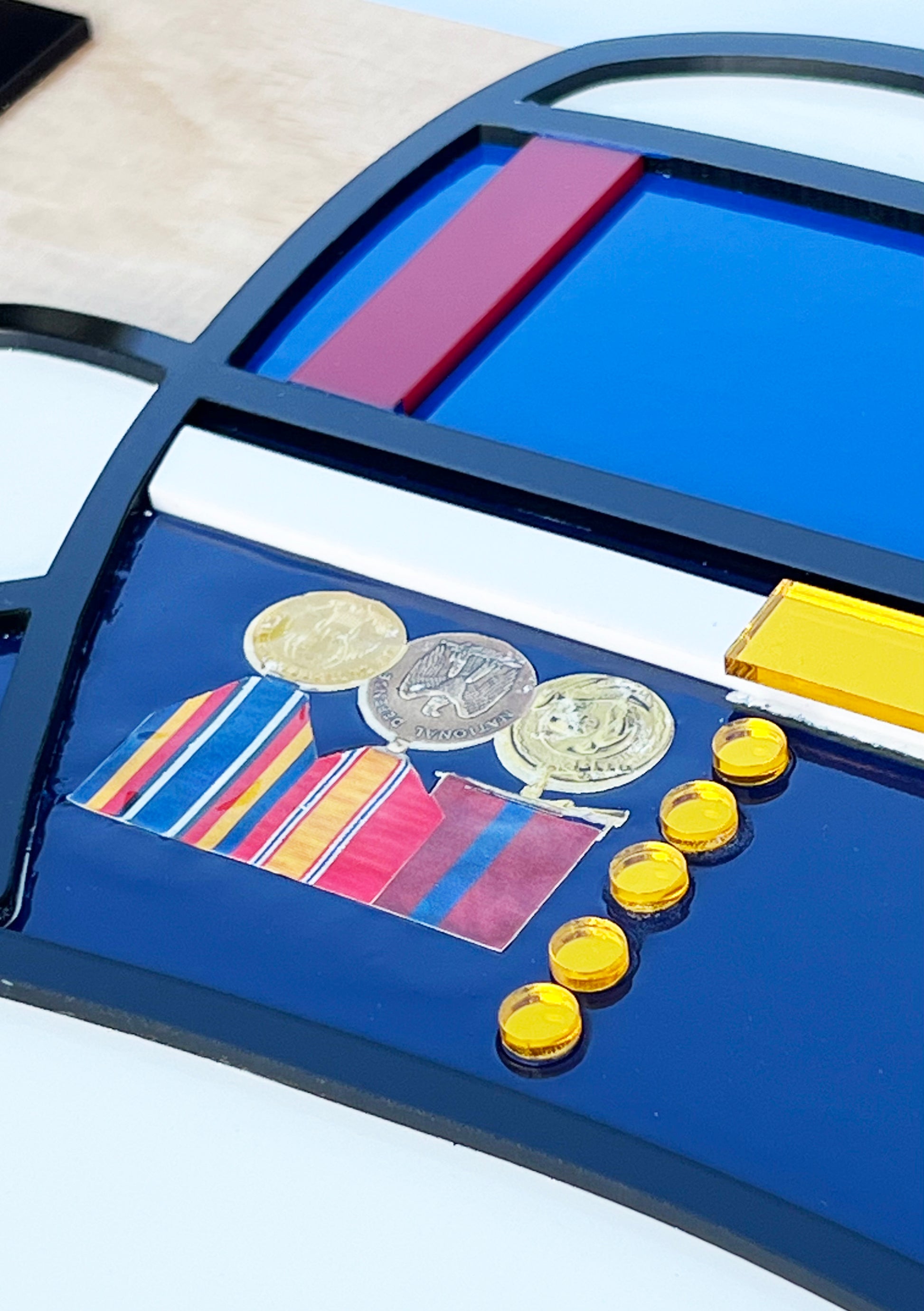 * Military ranks are laser cut from 1/8" acrylic, are glued together, and the colors vary depending on what military branch of service that you choose.